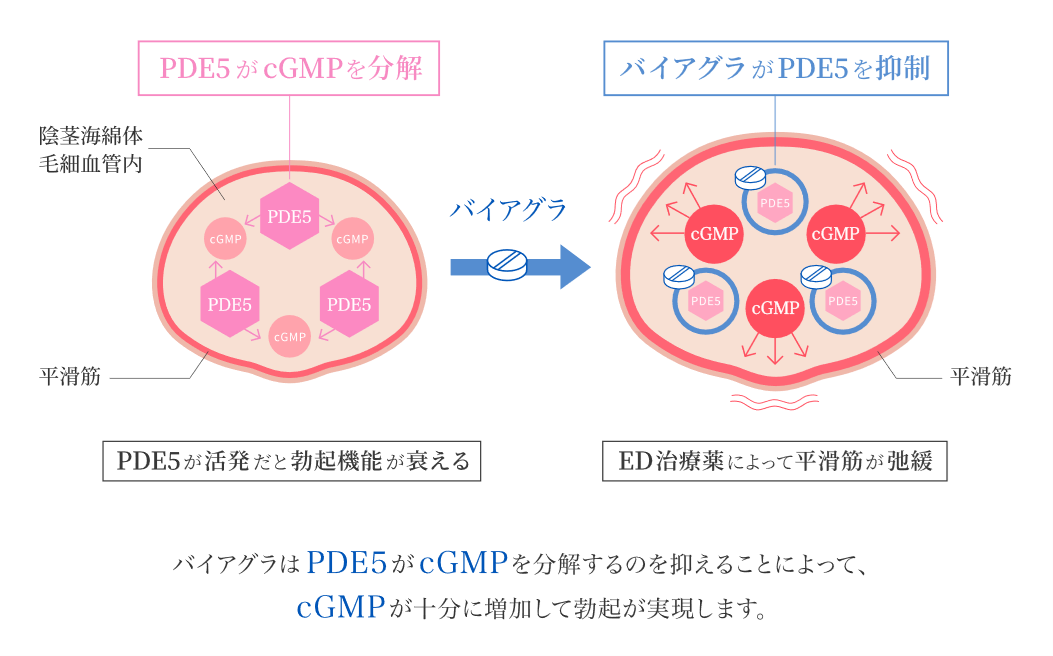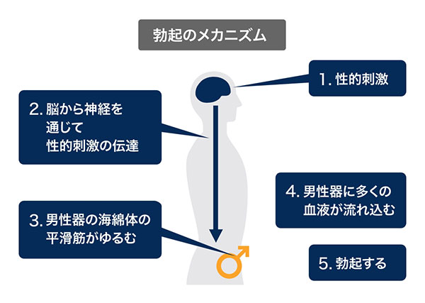 性的刺激があると、体内で環状グアノシン一リン酸(cGMP)という物質が生成されます。この物質が平滑筋を弛緩させ、陰茎の海綿体に血液を流れ込みやすくし、勃起に至ります。